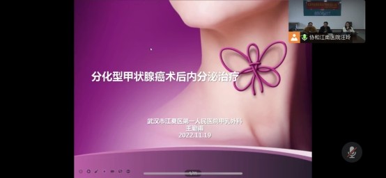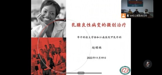 2022年11月19日,由江夏区第一人民医院(协和江南医院)甲乳外科主办的,武汉市继续教育项目“乳腺甲状腺疾病诊疗新进展学习班”线上会议在我院五楼远程会议中心成功举行。会议由我院甲状腺乳腺外科主任赵顺林主持,大会邀请了湖北省肿瘤医院副院长吴新红教授、湖北省肿瘤医院头颈外科主任朱又华教授、华中科技大学同济医学院附属协和医院刘春萍教授为大家进行了精彩的授课。