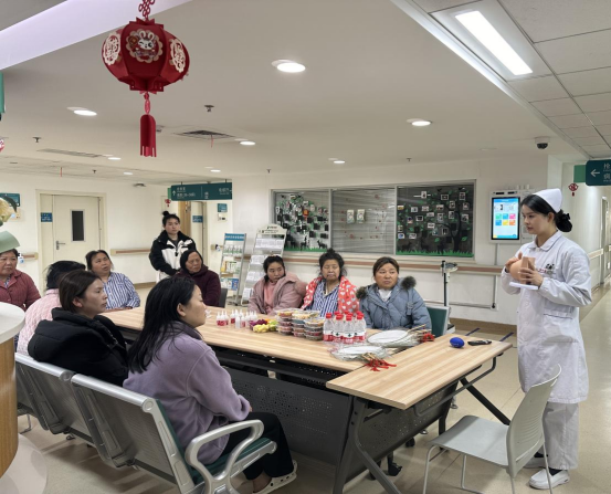 护士赵思思在病区内向患者及家属科普乳腺相关知识,先围绕乳腺基本知识、乳腺增生、乳腺纤维腺瘤,乳腺炎及乳腺癌的发病原因、疾病症状、乳腺自我检查等知识进行详细介绍,指导患者及家属每年进行乳腺超声检查,不能随意服用保健品,注意管理好自己的情绪。建议尽量在每次月经结束后,进行自我检查,并现场演示了乳腺自我检查方法。