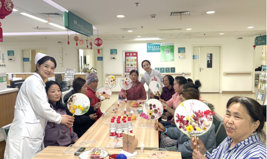 干货满满的科普活动结束后,护士长聂颖带领护士团队现场教患者及家属永生花团扇手工制作,大家根据材料包搭配的永生花,选择自己喜欢的色彩主题进行创作,经过一番慢工细活,最终制作出一幅幅独具匠心、美不胜收且具有观赏与实用价值的永生花团扇。