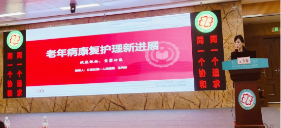 江夏区第一人民医院(协和江南医院)护理部副主任王秀珍在专题报告《老年病康复护理新进展》中,介绍了当前老年常见病康复护理的前沿理念与实践技术,课程强调多学科协作模式的应用、功能导向性康复训练在老年患者康复护理中的重要性。