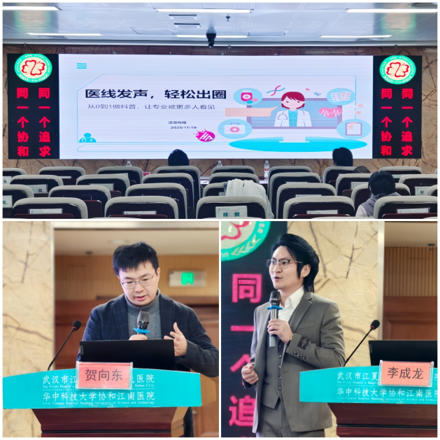 本次培训特邀汉派传媒集团总裁李成龙与贺向东老师联袂授课,围绕《医线发声,轻松出圈——从0到1做科普,让专业被更多人看见》这一主题,系统讲解了新媒体发展趋势、医院品牌形象塑造、医疗健康内容策划与创作技巧等实用内容。课程内容理论与实操并重,案例丰富,现场反响热烈。