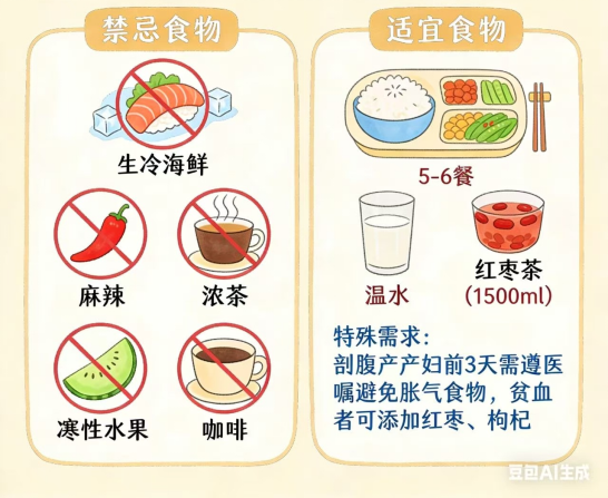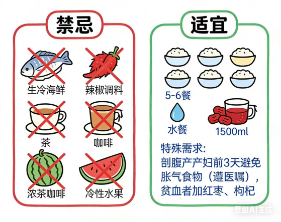 特殊需求:剖腹产产妇前3天需遵医嘱,避免胀气食物;贫血者可添加红枣、枸杞。