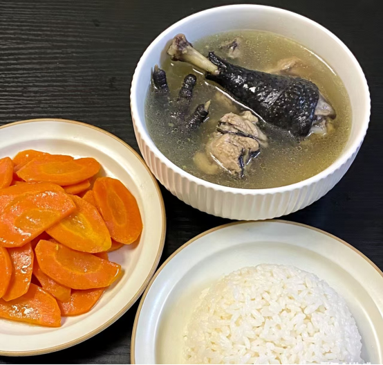 午餐:乌鸡汤(去油)+软米饭+清炒胡萝卜·乌鸡补气血,胡萝卜含维生素。