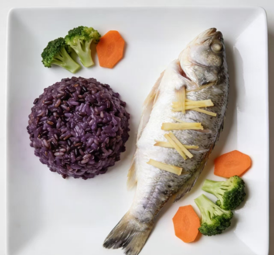 晚餐:紫米粥 +清蒸鲈鱼(少量姜丝去寒)·鲈鱼低脂高蛋白,紫米补血。