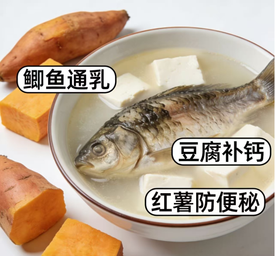 晚餐:鲫鱼豆腐汤+蒸红薯·鲫鱼通乳,豆腐补钙,红薯防便秘。