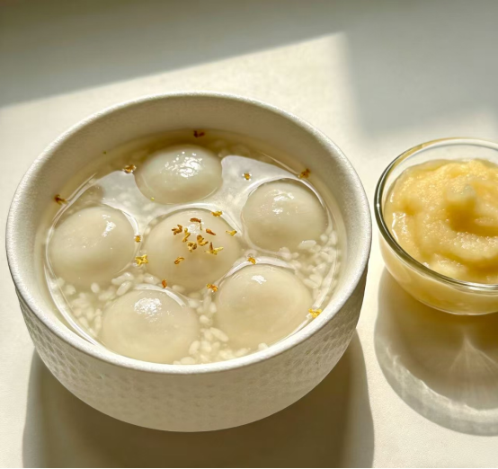 加餐:酒酿圆子(去酒精)+苹果泥·酒酿促循环,但需煮沸去除酒精。