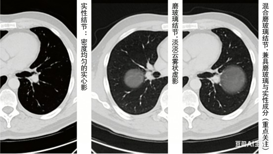 ·混合磨玻璃结节:兼有磨玻璃和实性成分,需重点关注其变化。