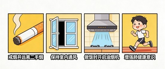 4、生活习惯要好:戒烟并远离二手烟,保持室内通风,做饭时开启油烟机,增强肺健康意识。
