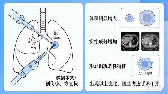 只有当结节在随访中呈现以下变化时,医生才会考虑手术治疗: