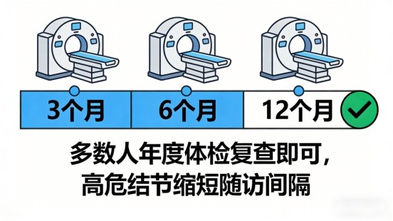 医生会根据结节的特征,建议随访间隔(如12个月、6个月或3个月复查CT)。多数人只需在年度体检时复查即可。定期随访是判断结节性质最安全、有效的方式。