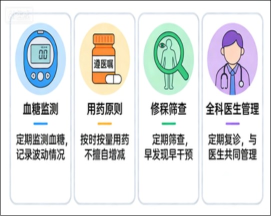 每年做一次:① 眼底检查(防视网膜病变);② 尿微量白蛋白(防肾病);③ 足部检查(防糖尿病足);④ 血脂、血压检查(防心脑血管病)