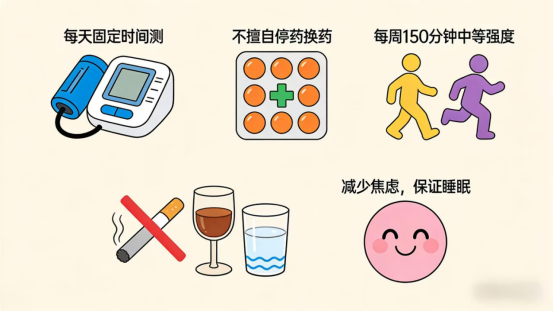 2. 规范用药:高血压是“终身病”,别因没症状就停药!血压波动比持续高血压更危险,调整用药需遵医嘱。
