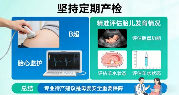 3.坚持定期产检:按时做 B 超、胎心监护等检查,医生能通过检查精准评估胎儿的发育情况、胎盘功能和羊水状态,给出专业的待产建议,这是母婴安全的重要保障。