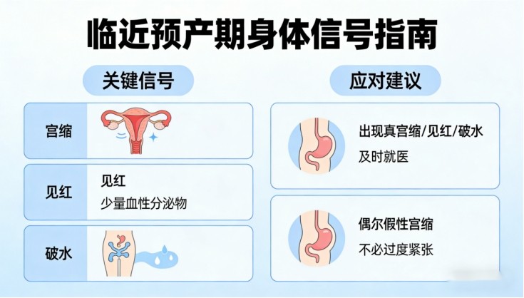 2.敏锐关注身体信号:临近预产期,多留意身体的变化,若出现宫缩、见红、破水等分娩征兆,及时就医即可,不必因偶尔的假性宫缩过度紧张。