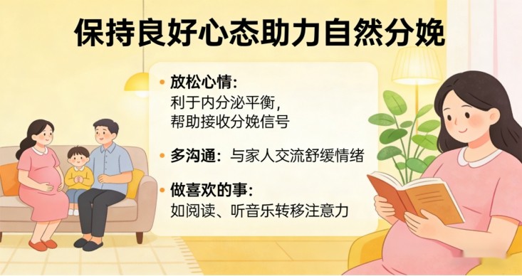 5.保持良好的心态:放松的心情有利于体内内分泌的平衡,反而可能帮助身体更好地接收分娩信号,推动分娩自然启动。不妨多和家人沟通,做一些自己喜欢的事,舒缓待产的情绪。